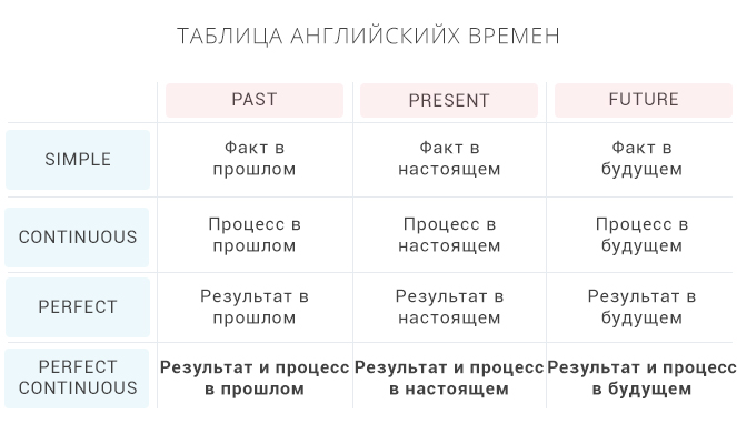 Английский язык обладает двенадцатью основными временами, которые делятся на четыре группы: