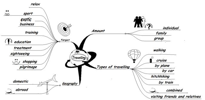 От центрального слова в вертикальных или ветвистых линиях добавляем связанные понятия, синонимы, антонимы, и примерные контексты․ Например: